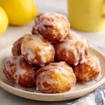 A pile of seven golden brown fried dough balls with light, shiny white glaze drizzled unevenly over the tops sits in the middle of a shallow white ceramic plate. The dough balls are rounded but irregular in shape, with crisp, textured surfaces peeking through the thin glaze. The plate rests on a white marbled surface, with part of a yellow mug and cut lemon blurred in the background, and a striped cloth napkin at the plate’s edge. photo taken with an iphone --ar 4:5 --v 7