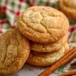 The image shows a close-up view of soft, round cookies stacked in a small pile, each cookie having a golden-brown color with a cracked surface texture. The cookies have slightly darker edges and lighter centers, giving a warm, baked look. Around the cookies, there are a few cinnamon sticks lying diagonally, adding a rustic touch. The background is a white marbled surface with a cloth underneath that has red and green check patterns, giving a cozy and inviting feel. Photo taken with an iphone --ar 4:5 --v 7