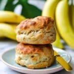Delightfully soft and fluffy banana scones made with mashed bananas, plant-based yogurt, and a hint of cinnamon, enriched with dairy-free dark chocolate chips or nuts. These easy-to-make scones are perfect for a comforting breakfast or snack, offering a dairy-free and egg-free treat with a naturally sweet flavor and tender crumb.