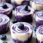 The image shows several small cheesecake cups arranged on a white marbled surface, each with two visible layers: a creamy off-white bottom layer and a purple top layer with smooth, swirled patterns. The swirl tops have a mix of light and dark purples blending into the off-white base, giving a marbled effect. Some cheesecake cups are decorated with single blueberries on top. Fresh blueberries are scattered around the cheesecake cups on the surface. photo taken with an iphone --ar 4:5 --v 7