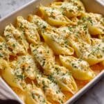 Buffalo Chicken Stuffed Shells combine tender jumbo pasta shells stuffed with a spicy buffalo chicken mixture, creamy cheeses, and tangy ranch dressing, baked to perfection with a melty mozzarella topping for a comforting and flavorful meal.