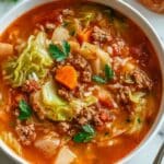 This comforting cabbage roll soup captures all the flavors of classic cabbage rolls in a warm, easy-to-make soup. Packed with ground beef, cabbage, tomatoes, and rice, it’s perfect for a cozy weeknight dinner.