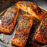 4. Glaze the Salmon: Spoon the honey butter sauce generously over the cooked salmon fillets in the skillet, briefly letting the sauce heat through with the salmon for about 1 minute, ensuring the fillets are well coated.
