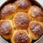 A round baking pan filled with nine soft, golden-brown rolls that are puffy and touching each other closely. Each roll has a slightly shiny surface with a dusting of fine white powdered sugar on top, creating a light, snowy effect. The rolls show a slight gradient of color, darker and crispier on top while lighter and fluffier on the sides. The pan edges show slight baking marks and the texture of the rolls looks airy and tender. The baking pan is set against a white marbled texture background. photo taken with an iphone --ar 4:5 --v 7