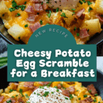 Keywords: cheesy potato egg scramble, breakfast scramble, cheddar cheese eggs, potato and eggs, easy breakfast recipe, skillet breakfast