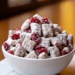 Cherry Cheesecake Puppy Chow is a sweet and tangy snack mix featuring crunchy Chex cereal coated in a luscious white chocolate and cherry gelatin glaze, dusted with a sweet cheesecake pudding powder, and studded with chewy dried cherries. This fun and easy-to-make treat is perfect for parties, movie nights, or any time you want a delightful dessert snack with a cherry cheesecake twist.
