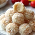 A white round plate holds a pile of small round balls, each covered with a layer of white shredded coconut and a light brown powder, giving a rough texture. One ball is lifted above the pile, showing its inside, which is soft, moist, and creamy white in color with a slightly grainy texture. The balls are closely packed together over a white marbled surface with blurred red and yellow objects in the background. Photo taken with an iphone --ar 4:5 --v 7