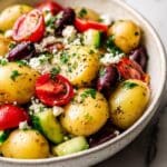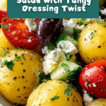 A refreshing and flavorful Greek Potato Salad featuring tender baby potatoes tossed with briny Kalamata olives, creamy feta cheese, fresh vegetables, and a zesty dressing made from olive oil, red wine vinegar, and classic Greek herbs.