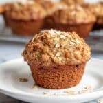 A close-up of a single muffin with a rough, golden-brown texture and topped with scattered oat flakes, sitting on a white plate with a subtle embossed edge design; the muffin surface looks crunchy and slightly crumbly with oats adding a rough texture on top; additional oat flakes are scattered loosely on the plate around the muffin. In the blurred background, more muffins of the same type are arranged on a cooling rack, showing the same color and texture. The whole scene is set on a white marbled surface, creating a clean and bright backdrop. Photo taken with an iphone --ar 4:5 --v 7