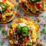 This Huevos Rancheros Breakfast Tostadas recipe combines crispy corn tostadas topped with creamy refried beans, sautéed vegetables, perfectly cooked scrambled eggs, and a medley of fresh and bold toppings like salsa, jalapeño, guacamole, sour cream drizzle, and fresh cilantro for a vibrant and satisfying morning meal full of Tex-Mex flavors.