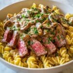 This Leftover Prime Rib Stroganoff is a delicious way to transform your roast into a creamy, comforting meal. Ready in just 20 minutes, it combines tender prime rib with savory mushrooms and a rich sauce, perfect for a quick weeknight dinner.