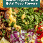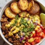 Keywords: loaded potato bowls, fiesta potatoes, roasted potatoes, taco seasoned beef, Mexican potato bowls, easy dinner, weeknight meal