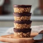 A stack of four oat and chocolate cups stands on a small wooden board over a white marbled surface. Each cup has a rough-textured oat base in light brown with visible rolled oats, topped with a smooth, shiny dark chocolate layer. The cups are neatly stacked, showing the contrast between the thick, crumbly oat layers and the glossy chocolate tops. Some loose oats are scattered near the board, and a metal spatula rests on the right side, all set against a blurred kitchen background. photo taken with an iphone --ar 4:5 --v 7