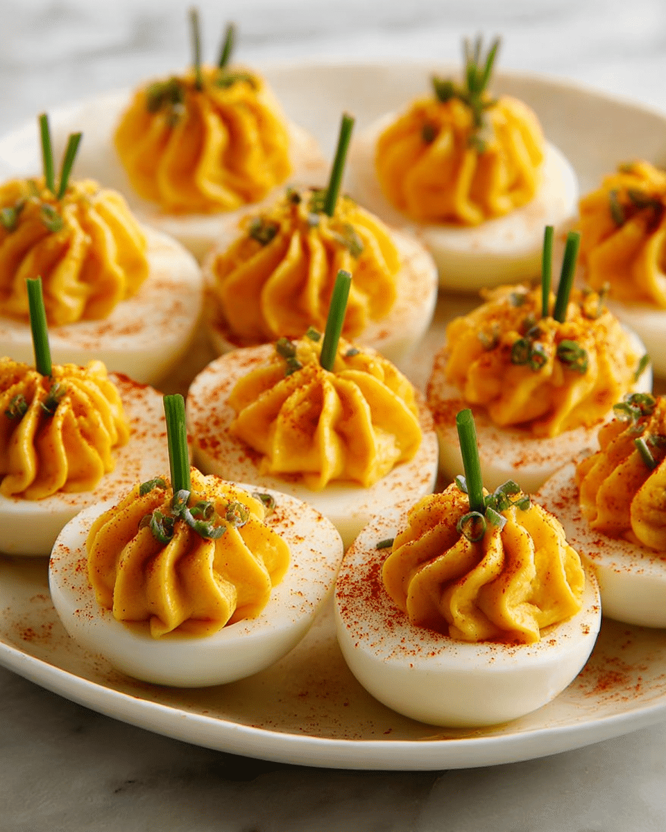 Pumpkin Patch Deviled Eggs are a festive and delicious twist on the classic deviled egg recipe, perfect for autumn and Halloween gatherings. These deviled eggs feature a creamy, tangy filling beautifully tinted with a touch of orange food coloring and dusted with paprika to mimic miniature pumpkins, complete with fresh chive stems for added charm and flavor.