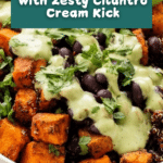 6. Assemble the Bowls: Divide the seasoned quinoa evenly into 2 or 3 serving bowls. Top each bowl with black beans and roasted sweet potato. Drizzle the cilantro cream evenly over the top and garnish with additional cilantro if desired. Serve immediately.