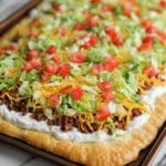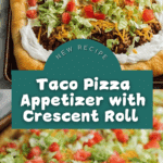 This Taco Pizza Appetizer is a fun and flavorful twist on classic pizza, featuring a crescent roll crust topped with a creamy base, seasoned taco meat, and fresh toppings. Perfect as a party appetizer or snack, it combines the savory goodness of tacos with the cheesy delight of pizza in a convenient and easy-to-make dish.