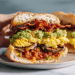 The Ultimate Breakfast Sandwich is a hearty and flavorful way to start your day. Packed with eggs, bacon, melted cheese, and creamy guacamole, all layered inside a flaky croissant, this sandwich is sure to satisfy your morning hunger with a delicious twist.